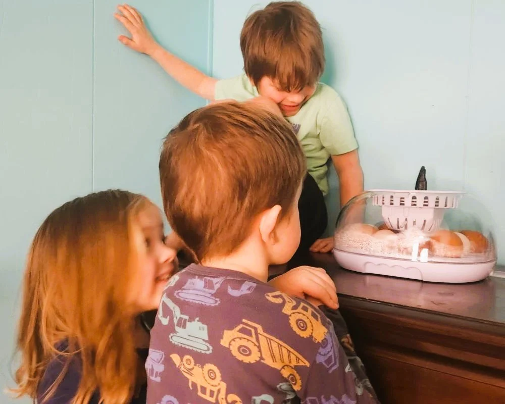 We’ve got another, smaller incubator going at my sister in law’s house so that her kids can share the experience. Once those eggs hatch, they’ll join our hatchlings in the brooder. Tending the poor motherless chicks through the first, vulnerable days of their lives is an anxious time.